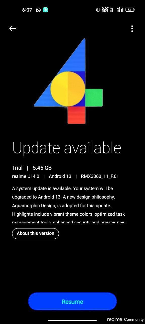This Update Version is RMX33601_11_F.01 and the Size is 5.24GB Only Beta Users Get This Update